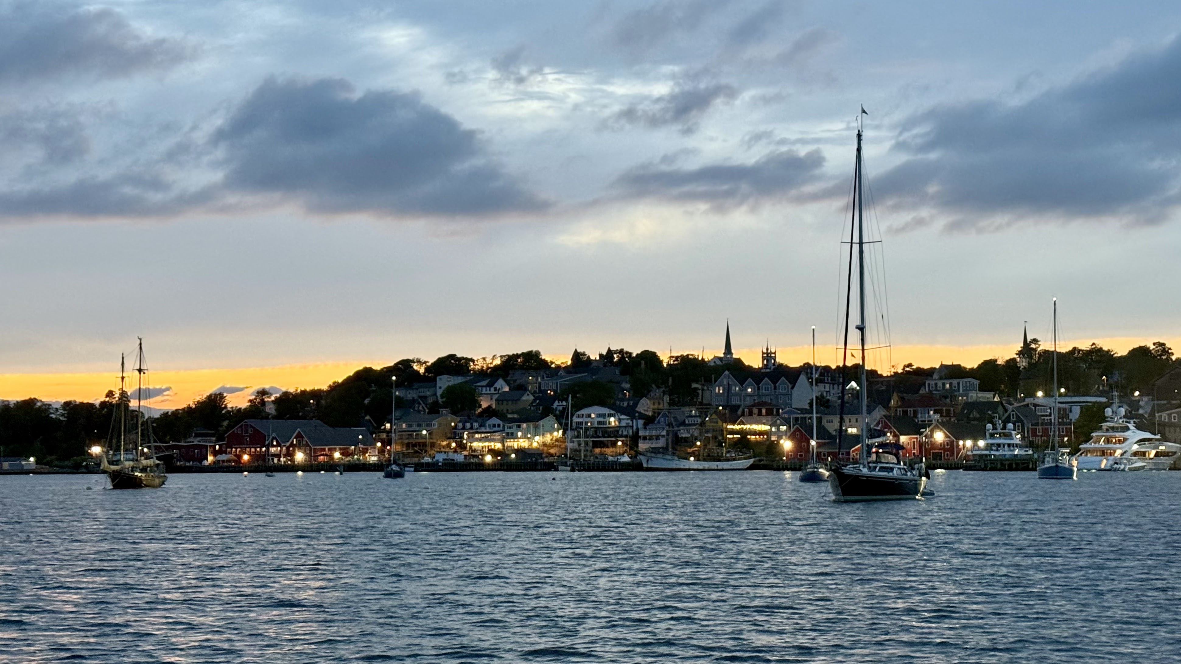 After our first day of exploring Lunenberg, we returned to Mantra after dinner ashore and enjoyed a relaxing evening as the town lights began to shine as the setting sun created a glowing yellow layer of bright color above the treetops.